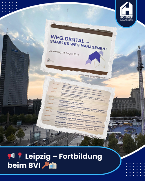 Am 27. und 28. August 2025 besuchten Dirk und Susann Honnef die Tagung „WEG.DIGITAL – Smartes WEG Management“ des BVI (Bundesfachverband der Immobilienverwalter e.V.) in Leipzig.
